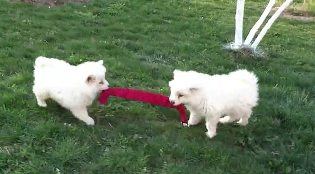 This thought comes to mind as we watch two adorable pure breed Russian Samoyed puppies! They are fluffy and white and, with their little growls and whimpers, we are reminded of those days when we were kids when something as simple as a rope or, in their case, a belt could mean fine times and great toys!